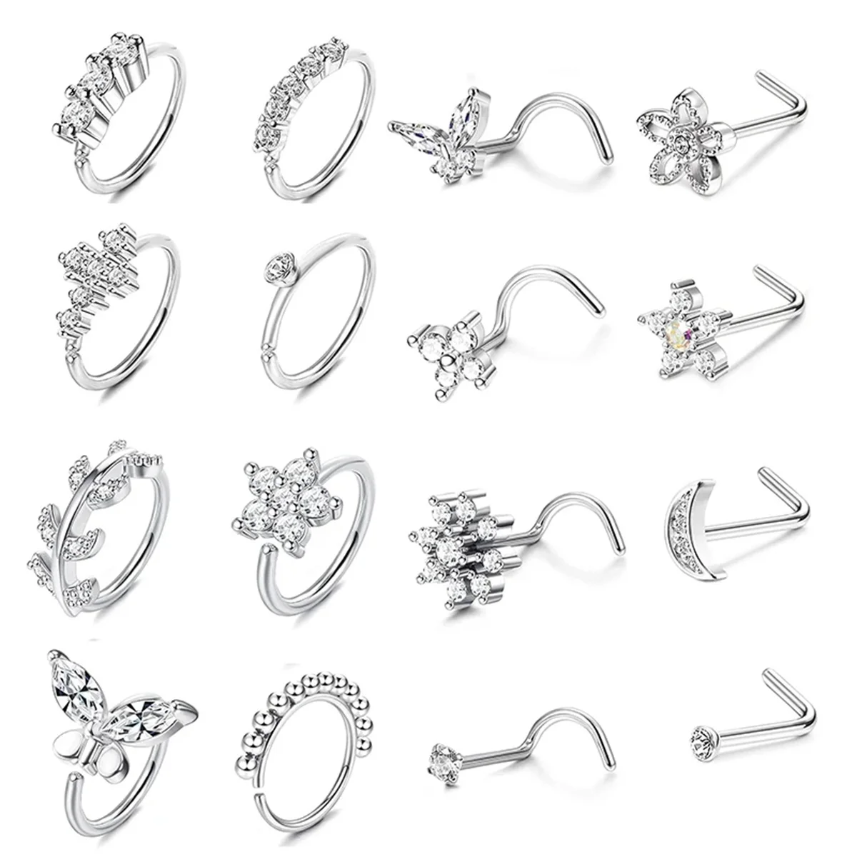 16Pcs 20G Flower Butterfly Nose Rings Hoops,Inlaid Shiny Zircon Nose Screw Nose Body Piercing Jewelry Decoration