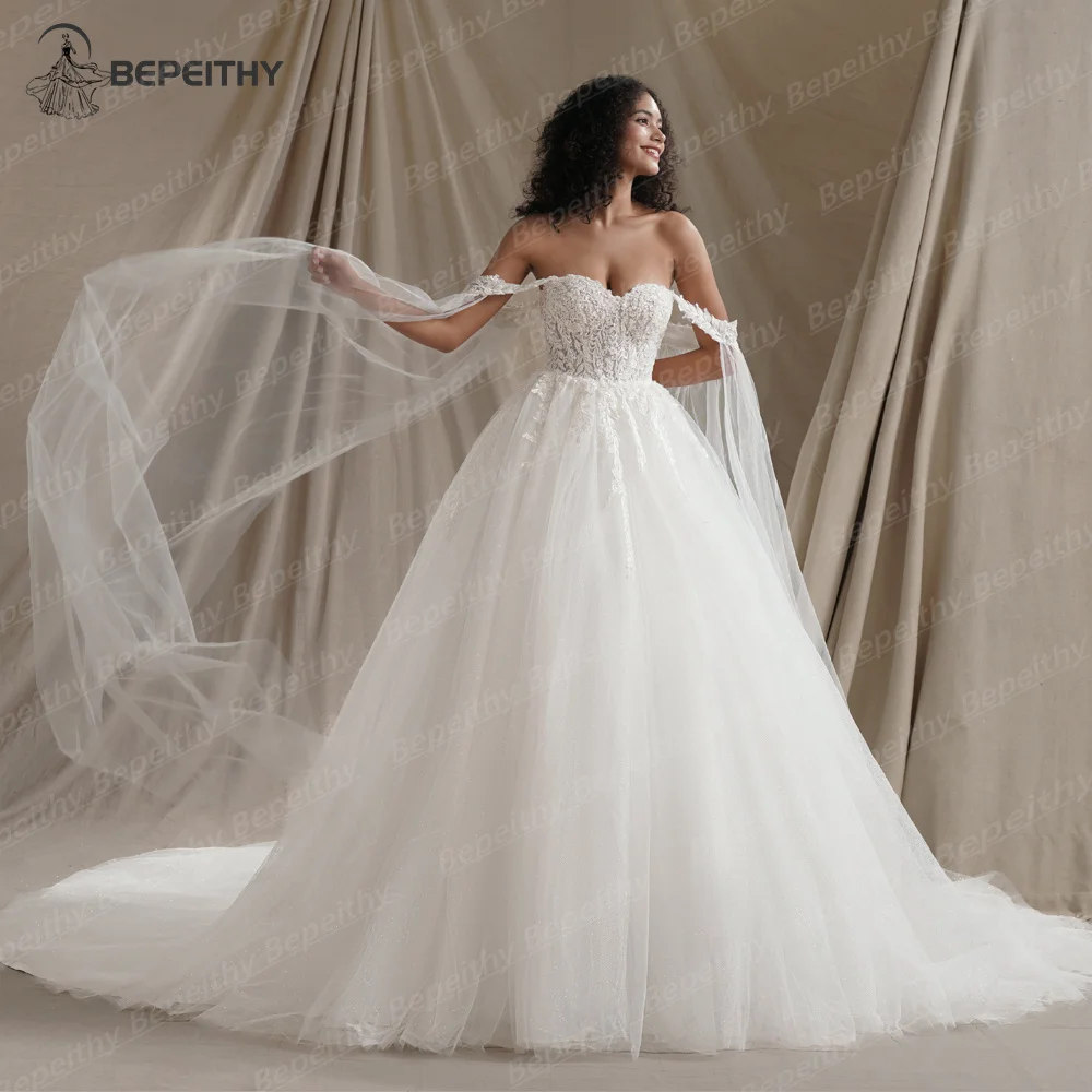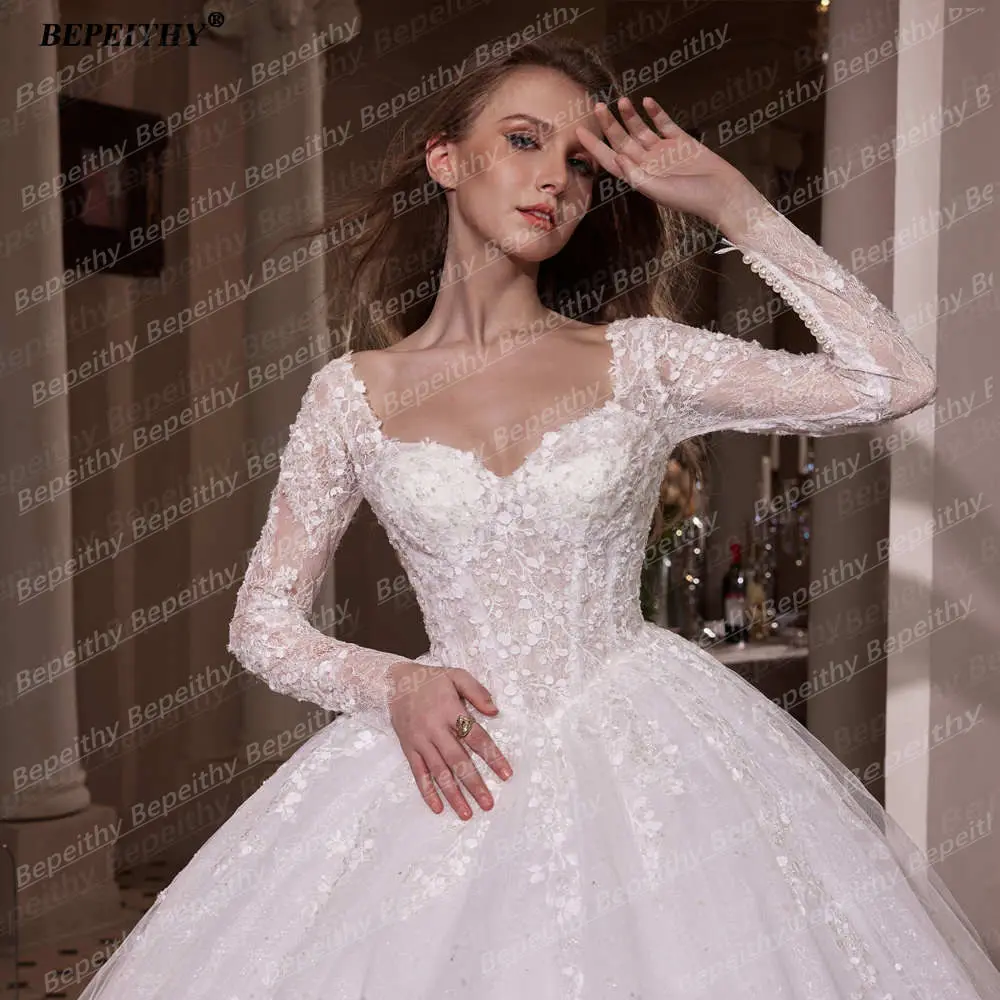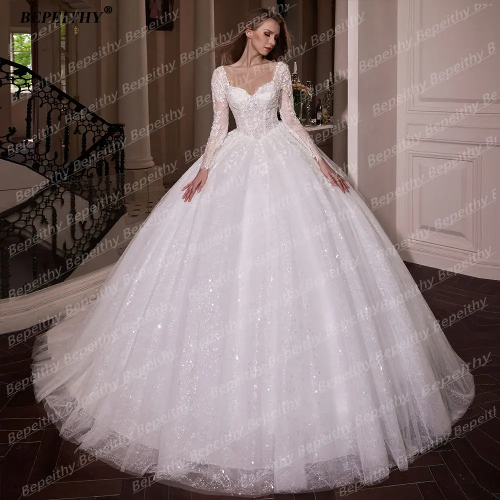 BEPEITHY Customized Princess Glitter Ivory Wedding Dresses Women Full Sleeves Lace Ball Bridal Gown Court Train 2025 Sweetheart