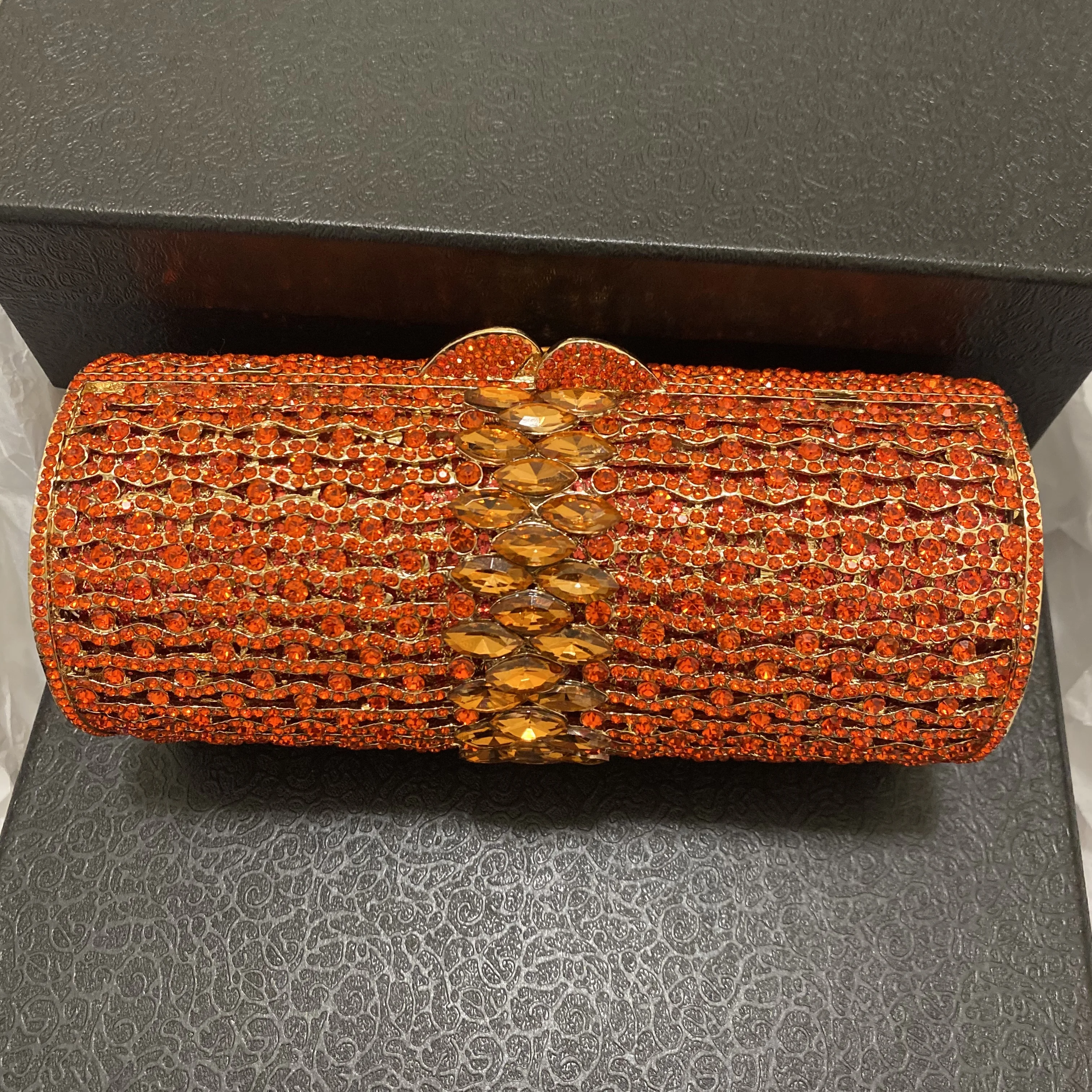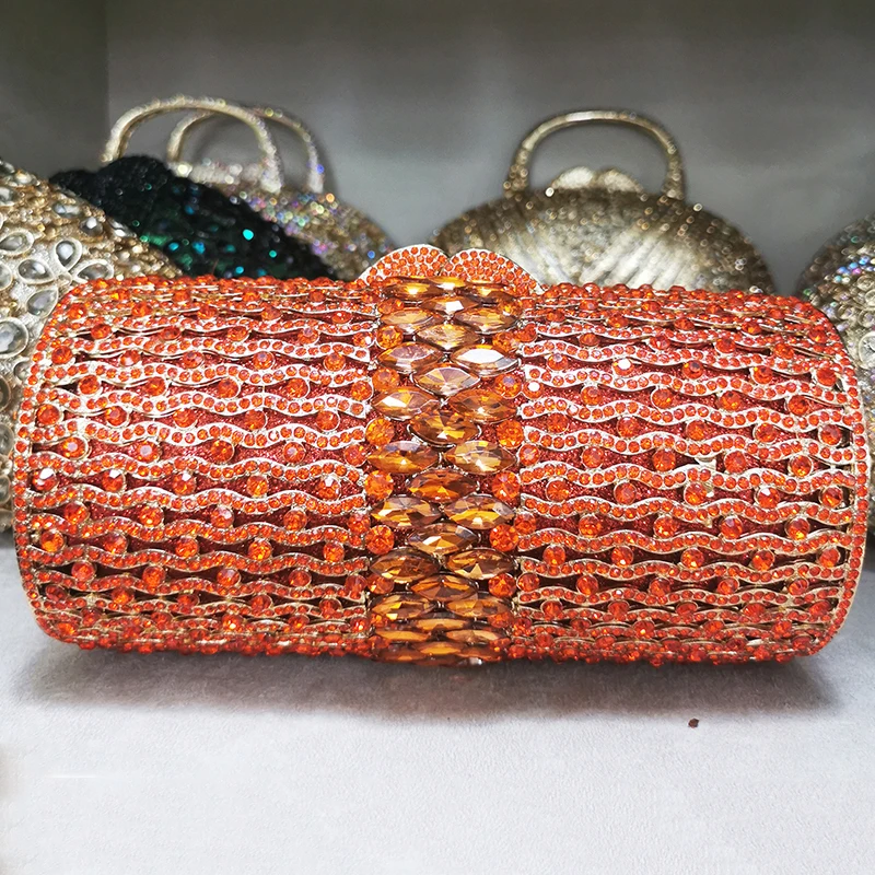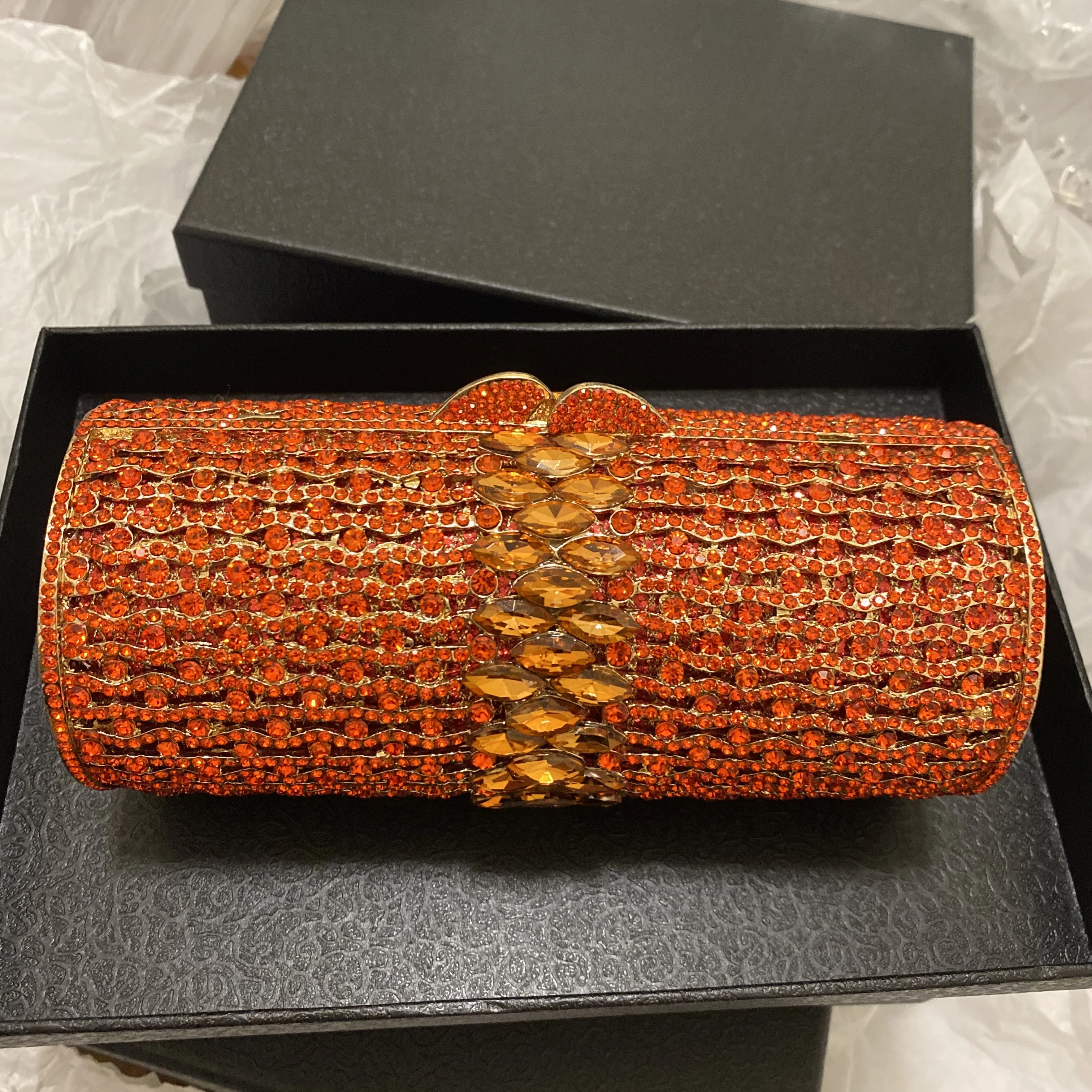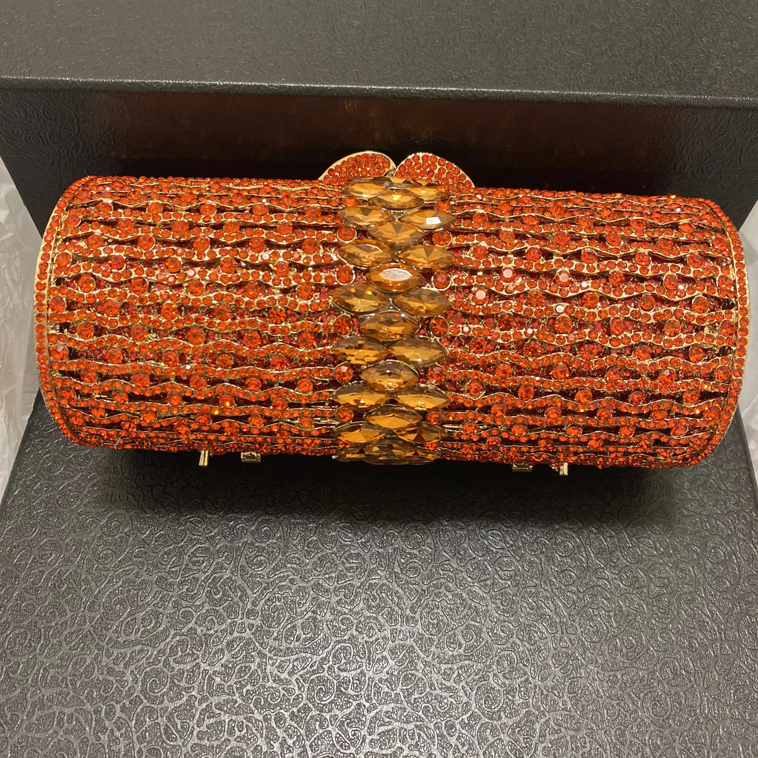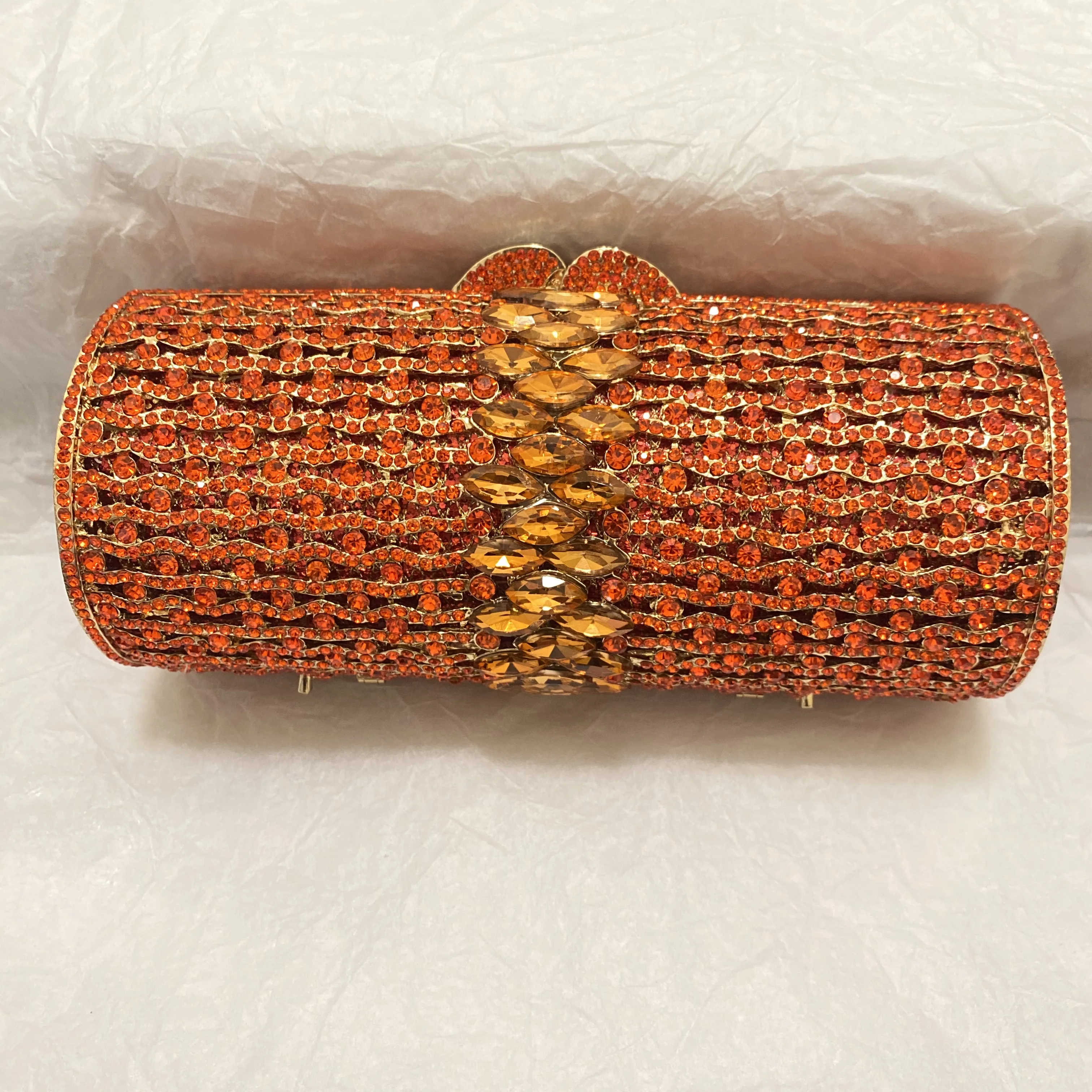 Orange Evening Bags Purses Cylindrical Shape Sliver/ Gold Wedding Bridal Purses Women’s Diamond Bag Formal Rhinestone Clutches