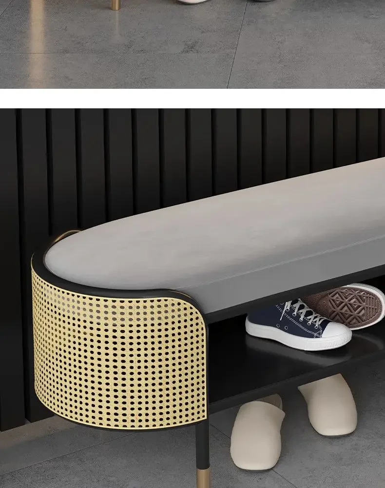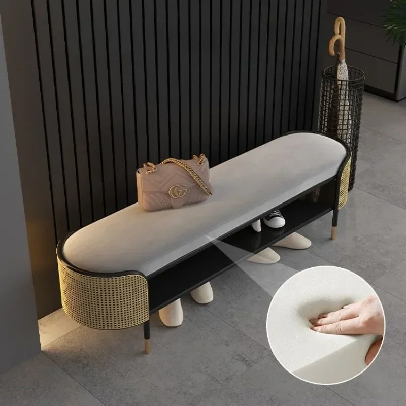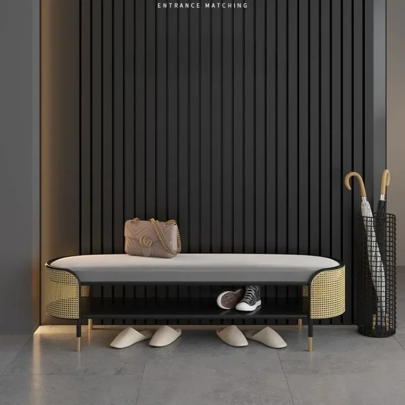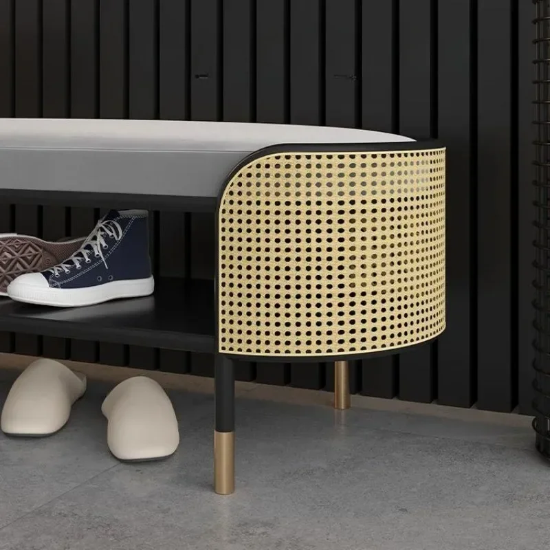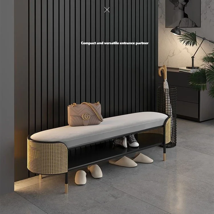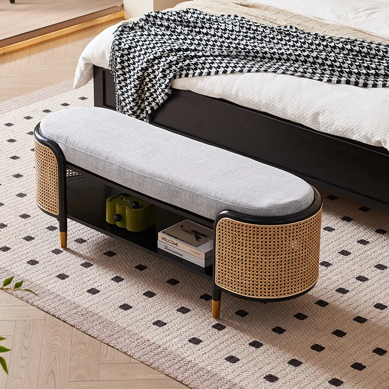 Solid Wood Rattan Shoe Changing Stool,Living Room Fabric Sofa Stool,Modern and Simple Lobby, Light Luxury Homestay Bed End Stool